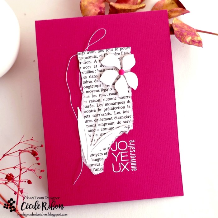 Bon mercredi à tous, c’est le jour du nouveau challenge Freshly Made Setches et, j’ai le plaisir de proposer le sketch de la semaine. Rien de très sophistiqué, juste une forme un peu biscornue et un élément par dessus. Bien sûr, vous êtes libre d’opté pour quelque chose de plus régulier si vous le préférez. Pour ma part, j’ai opté pour une morceau de page de livre déchiré et une simple fleur.