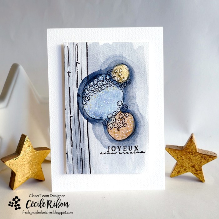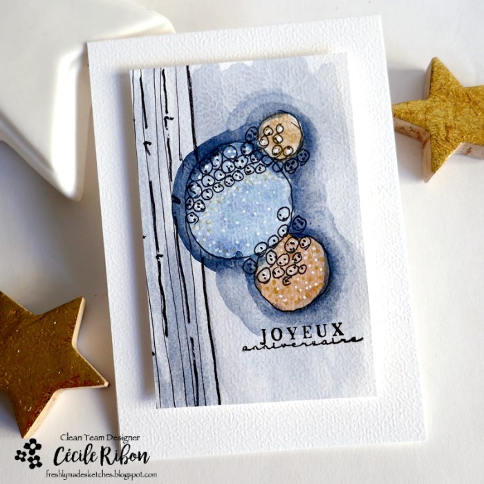 I’m a bit late in introducing this week’s Freshly Made Sketches challenge, which features Michelle L‘s very first sketch as a design team member. Her fun composition of circles inspired me an abstract watercolor design. No dies and no stamps, just watercolor, a black ink pen and the pleasure of freely playing with the colors and shapes.