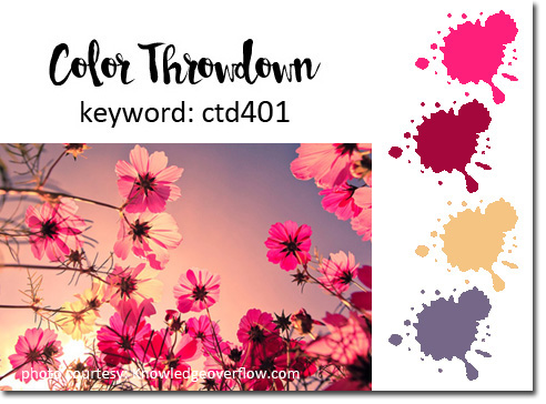 Encore un challenge avec des couleurs très « Girly » et c’est chez Color Throwdown que cela se passe. Pour rester dans le Clean, j’ai souhaité ne les utiliser qu’à petites doses. J’ai donc encré un morceau de cardstock blanc avec chacune des couleurs demandées en les fondant ensemble au centre. Puis j’ai embossé un tampon rose à l’encre noire et à la poudre « clear » et voici ce que cela donne :