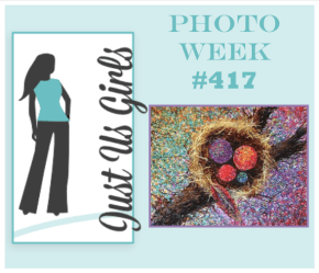 No Christmas card for today but a birthday card instead. It’s been inspired by this week’s Just Us Girls challenge. It’s photo week and Judy has chosen a colorful painting for us to work with. I decided not to feature a feather nor nothing about birds in my card . But, I played with my watercolor pencils to create a background with multiple tiny colorful splaters that mimic the painting. I also used a die-cut that more or less recall the structure of the nest.