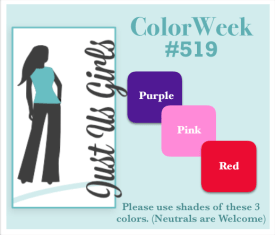 Happy Saturday and welcome to the newest Just Us Girls Challenge. It’s color week and Sue has chosen Purple, Pink and Red. I must confess I’m not totally at ease combining those three colors on a same card. Anyway, here is what I came up with.