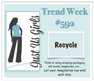 Happy Saturday everyone! Welcome to this week’s  Just Us Girls  challenge. It’s Trend week and Sue wants you to include some recycled items on your project. I chose a garment tag, a flyer that came with an order delivery, and a ribbon coming from the inside of a garment. I cut the word « Merci » (Thank you) out of the flyer and cut the smaller part of the tag.