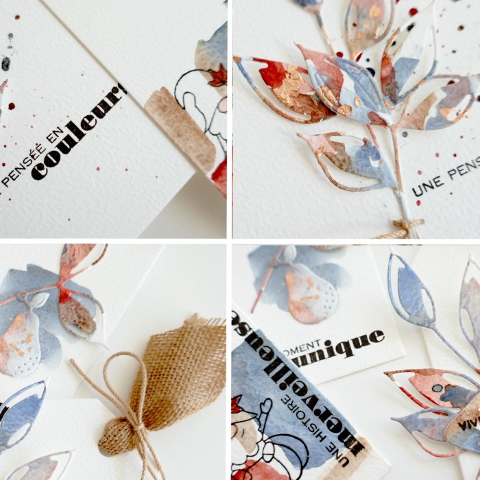 Au programme, une carte, un marque page et un ensemble de 3 tags. Le tout avec la collection d’automne bien sûr et avec un travail à l’aquarelle … en voici un aperçu