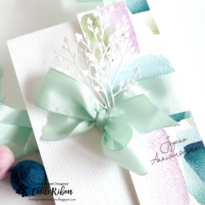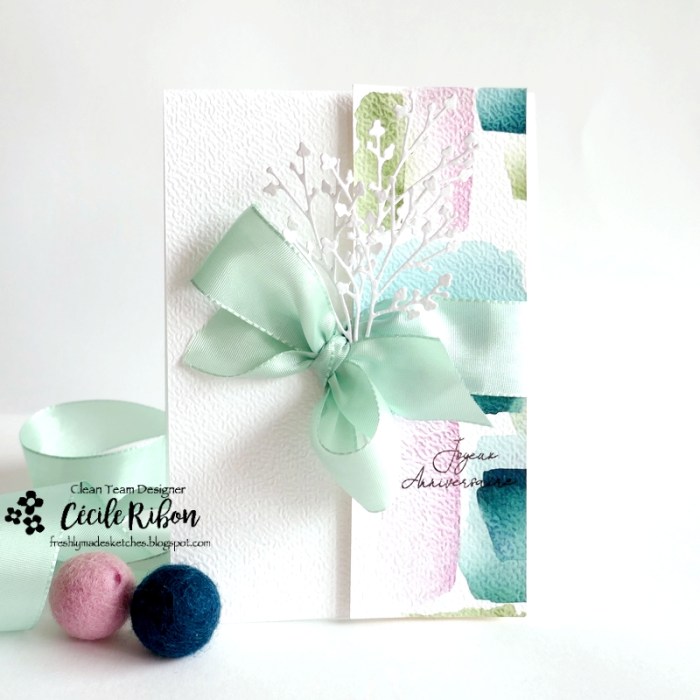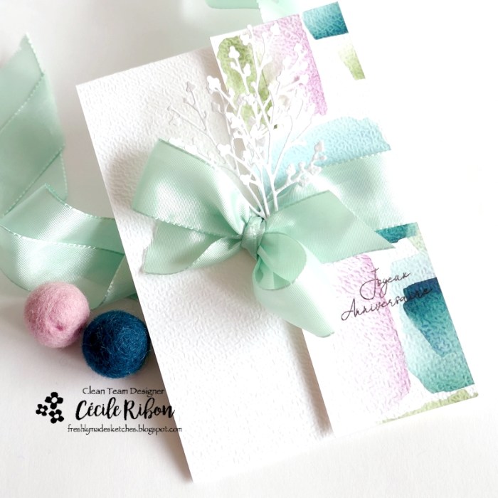 Le nouveau challenge Freshly Made Sketches est arrivé et le sketch de la semaine vous est proposé par Jen B. Cette composition de deux panneaux verticaux m’a donné envie de créer un fond abstrait à l’aquarelle. Je l’ai enveloppé d’un gros noeud de ruban qui tient lieu, à la fois, du rectangle et du cercle (ou comment faire d’une pierre, deux coups 😉 )
