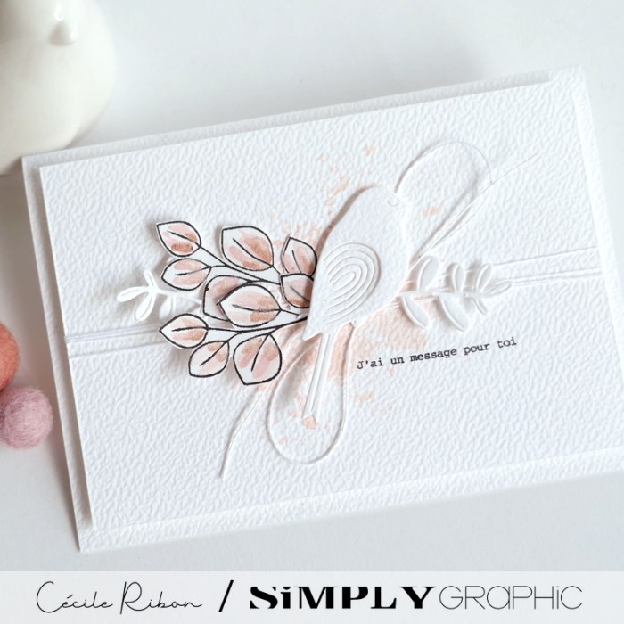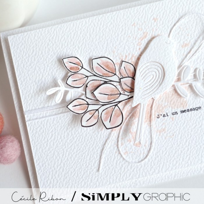 Pour ma part, en voici ma 6ème illustration. Et oui, finalement j’ai fait toutes les lignes et toutes les colonnes proposées. Pour terminer, voici donc une carte avec la colonne B (Rose, oiseau et détourage) réalisée en puisant parmi les matrices de coupe et tampons de diverses collections. (Voir la liste sous les photos)
