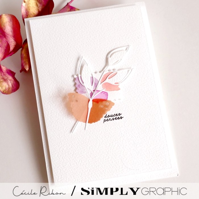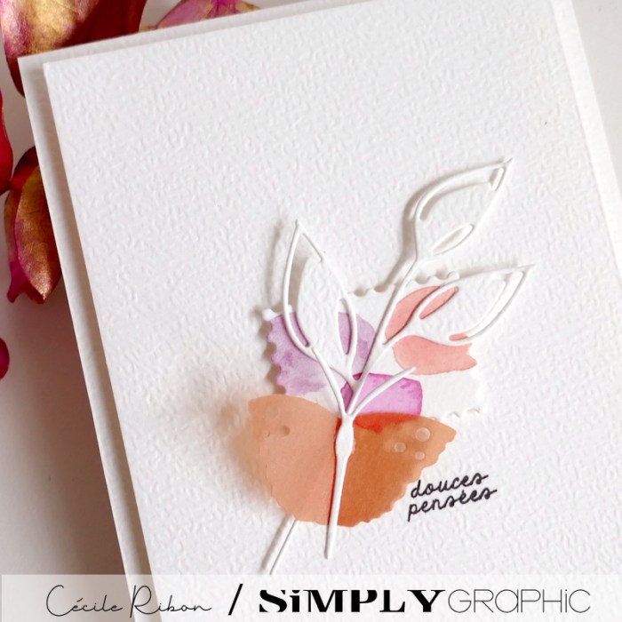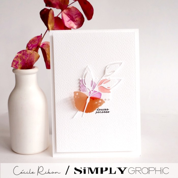 Et, cette fois encore, j’ai utilisé une bandelette de papier sur laquelle j’avais fait des essais de couleurs. j’en ai découpé le timbre poste qui sert de fond à une composition minimaliste. Deux découpes, un sentiment et rien de plus. Il m’a semblé que les touches colorées à l’aquarelle associées à celle du papillon suffisait à faire une carte.