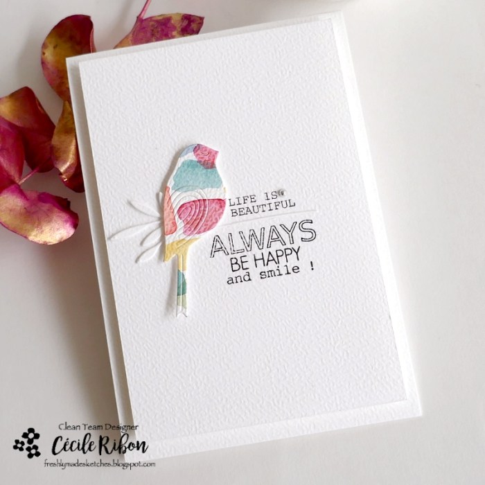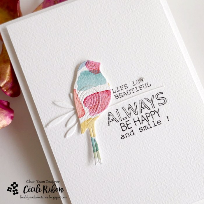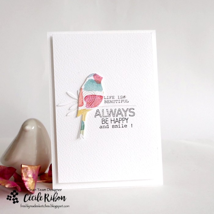 Happy Wednesday everyone! It’s time for a new Freshly Made Sketches challenge and Kim is this week’s sketch designer. This week again, the sketch gave me a perfect opportunity to upcycle some leftovers and die cut the bird out of a piece of paper I had been trying out some watercolors on.