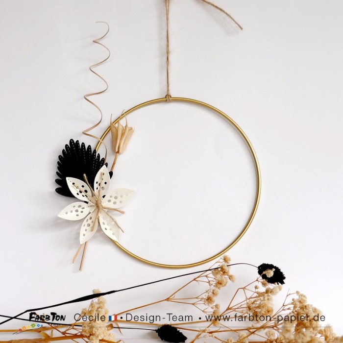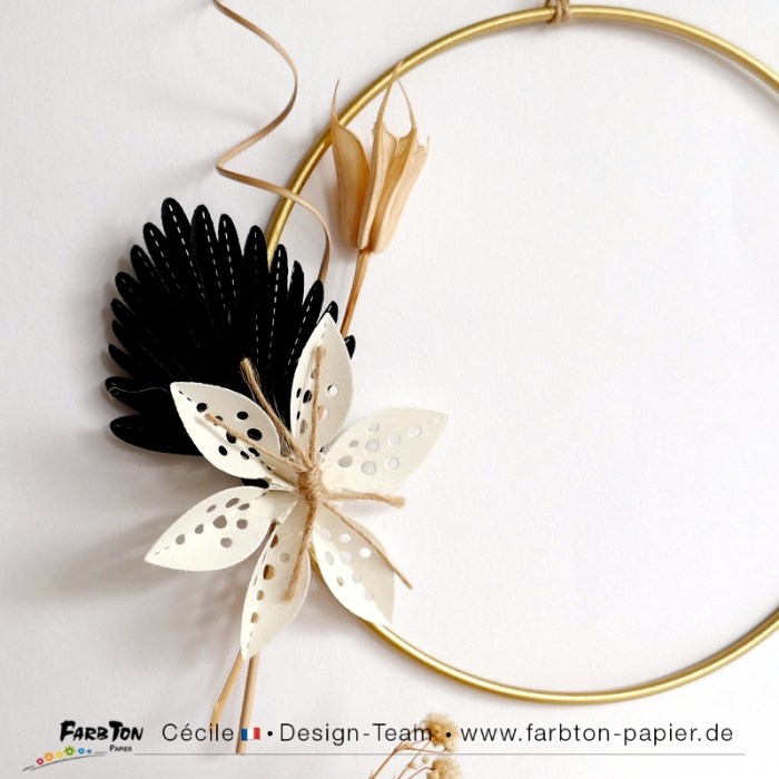 J’aime beaucoup réaliser des couronnes décoratives associant fleurs en papier et fleurs séchées. Celle du jour est minimaliste et dans un combo sobre mais chic Noir/blanc/or avec des éléments naturels (fleurs séchées et ficelle de jute).