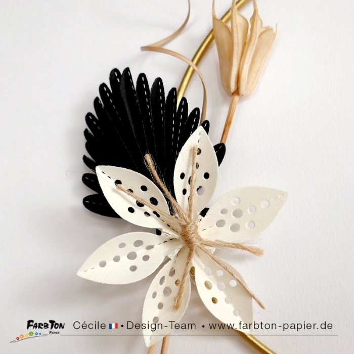 Pour les fleurs en papier, j’ai utilisé deux matrices de coupe Farbton Papier , une élégante fleur aux pétales ajourés ainsi qu’une feuille en forme d’éventail ( cette dernière est conçue en collaboration avec @nadinespapepteria )