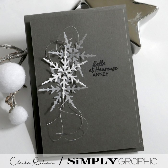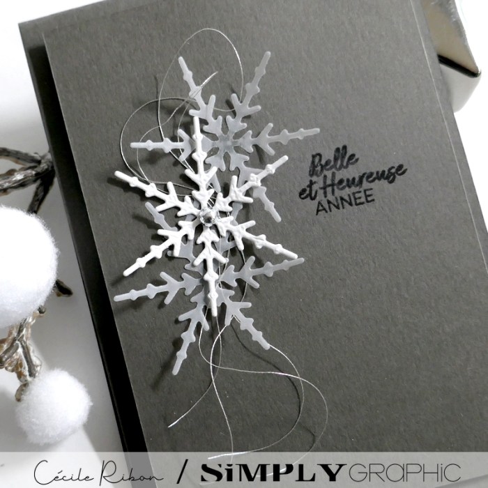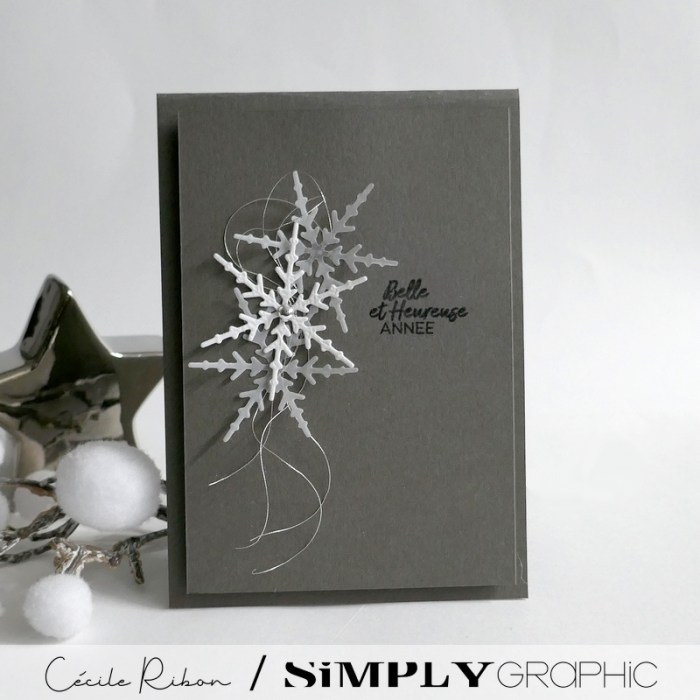 Cet élégant flocon mérite de ne pas partager le devant de la scène. Alors, pour ma carte, je le laisse attirer tous les regards en solo … juste un sentiment et quelques discrets embellissements.