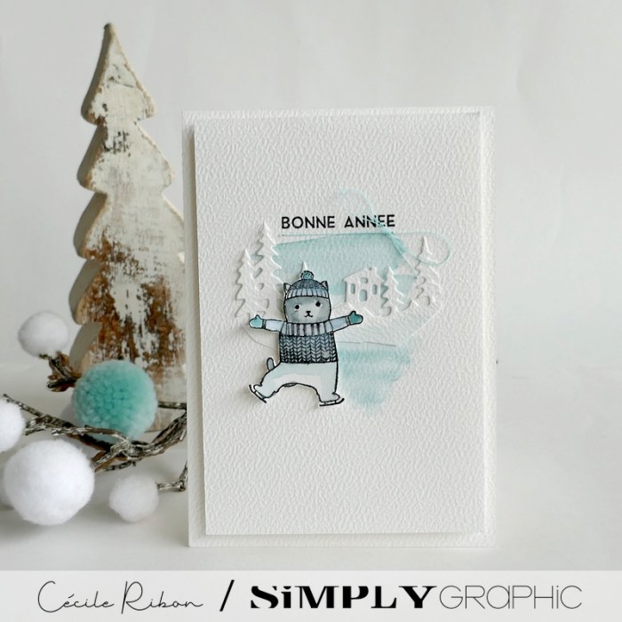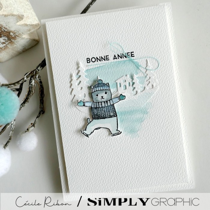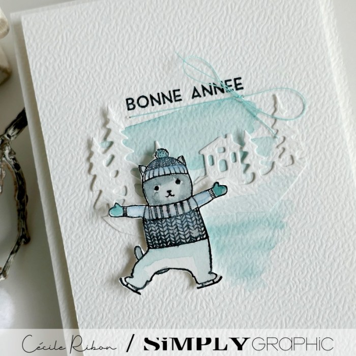 Et voici ma version, un parti pris de fraîcheur et de mignonnerie avec un paysage hivernal constitué de plusieurs découpes recoupées et réagencées et aussi cet adorable minou patineur.
