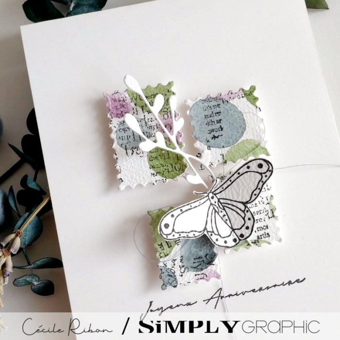 Le fond de carte est composé d’un ensemble de formes de timbre que j’ai découpées dans un papier préalablement aquarellé de différentes couleurs et sur lequel j’ai appliqué différents tampons de fond.