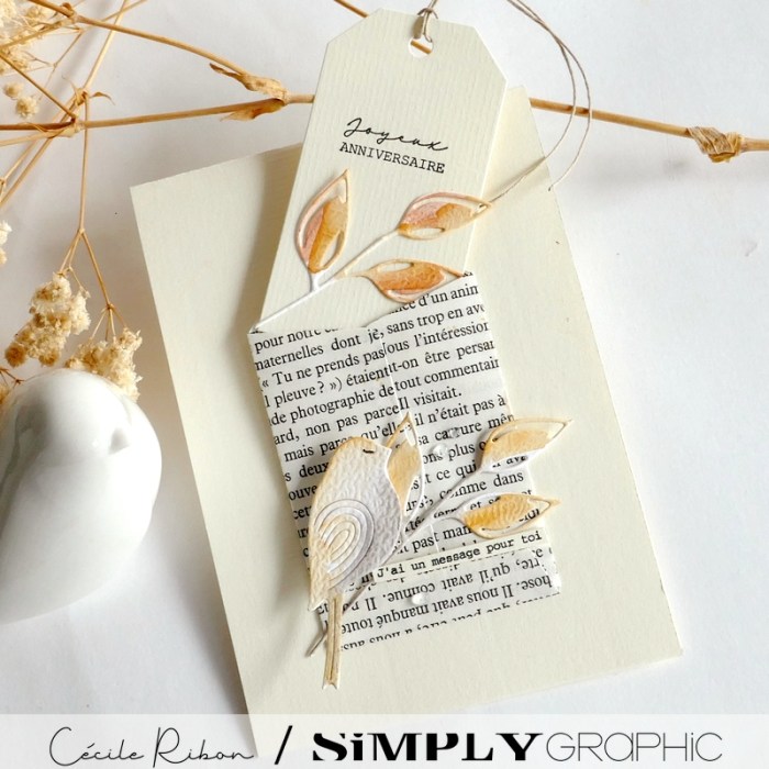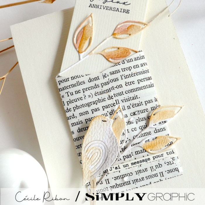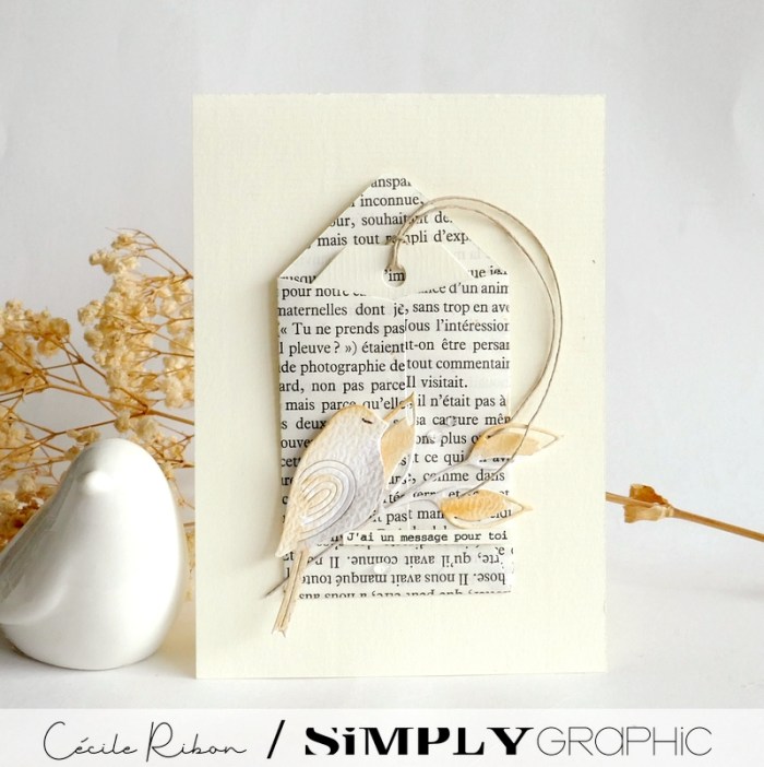 Voici donc une carte une carte avec un oiseau porteur d’un message d’anniversaire. Les découpes de l’oiseau, des feuillages ainsi que l’enveloppe confectionnée avec une page de livre, faisaient partie des restes, il ne me restait plus qu’à les mettre en scène.