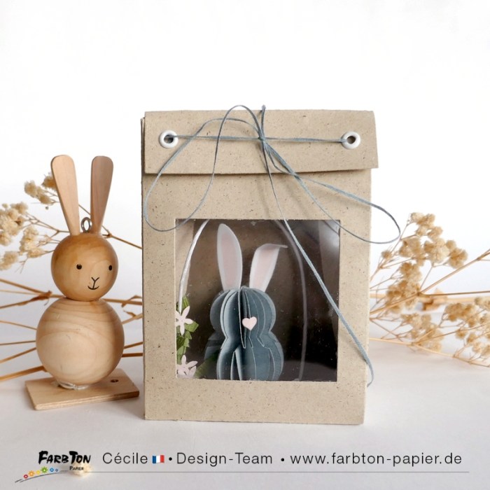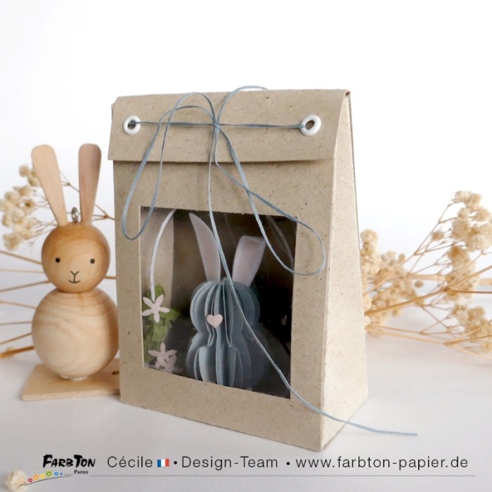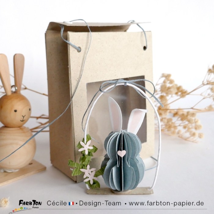 J’ai opté pour une boîte toute simple mais avec une fenêtre laissant apercevoir une mini décoration de Pâques. (Egalement réalisée avec des produits Farbton Papier)