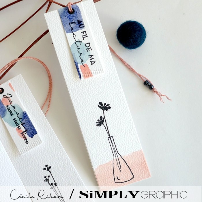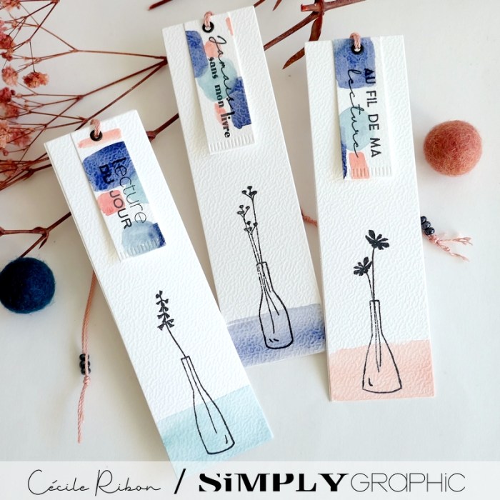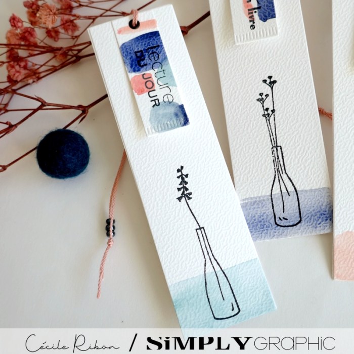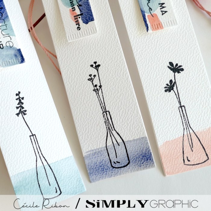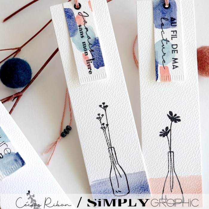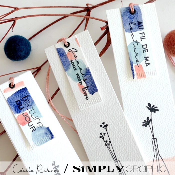 Pour illustrer ce combo, j’ai eu recours à ma technique préférée. J’ai sorti mes godets d’aquarelle pour « barbouiller » librement une feuille aux couleurs demandées. Ce qui m’a permis de réaliser plusieurs illustrations de ce combo. Pour aujourd’hui, point de carte, mais une série de marque-pages. J’ai découpé les étiquettes dans ma feuille aquarellée et ajouté un léger rappel de couleur en bas des marque-pages.