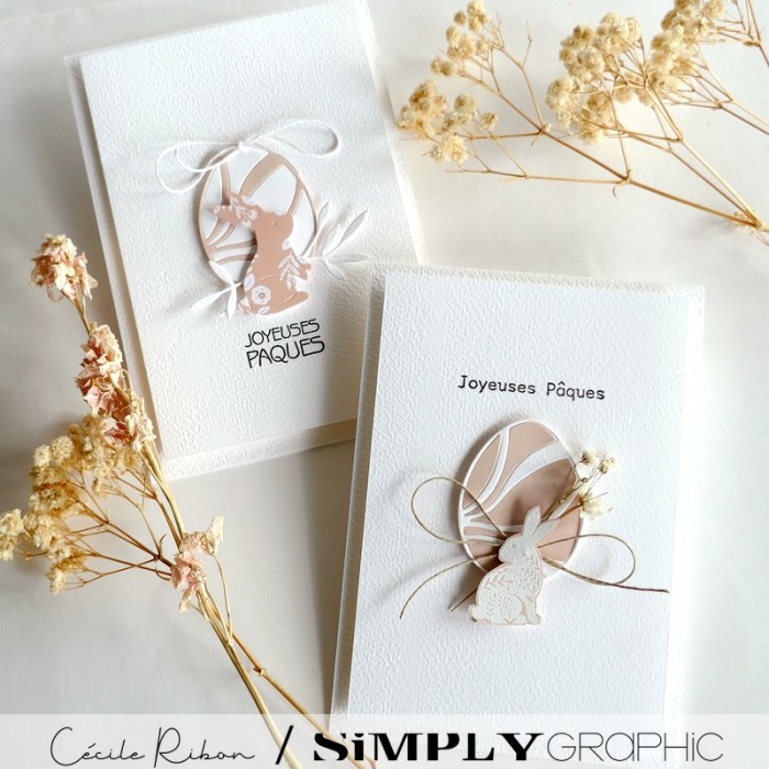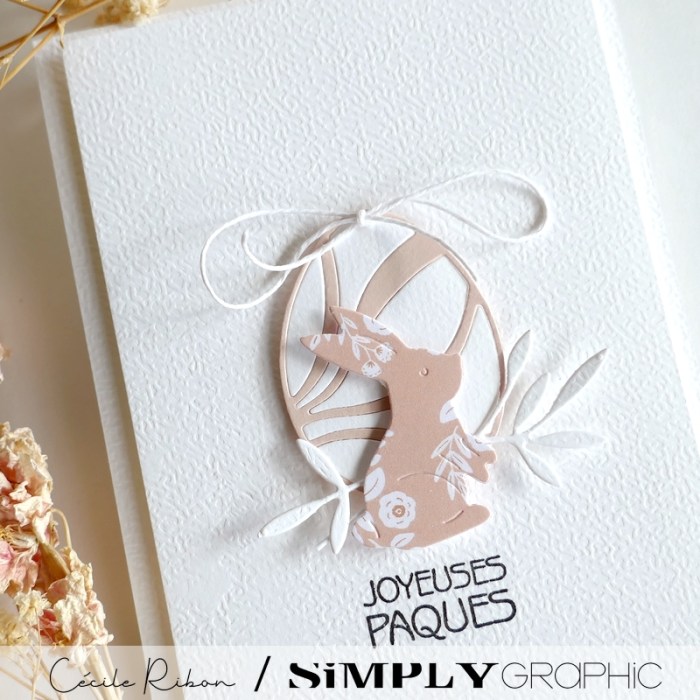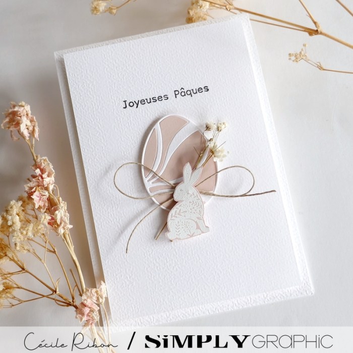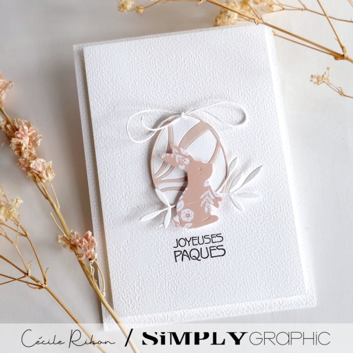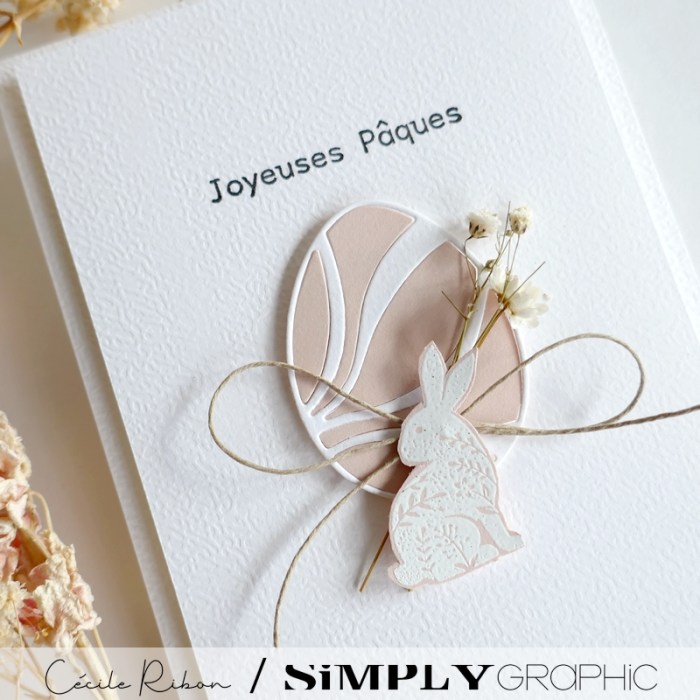 C’est un vrai plaisir de jouer avec la mini collection spéciale Pâques de Simply Graphic. Vous y trouverez 2 sets de matrices de coupe (une avec des œufs et une autre avec d’adorables lapins) et une planche de tampons avec des sentiments, bien sûr, mais également, des œufs et des lapins. Une mini collection qui a tout d’une grande.