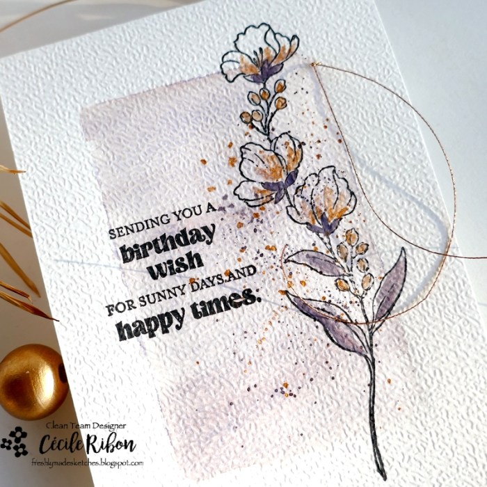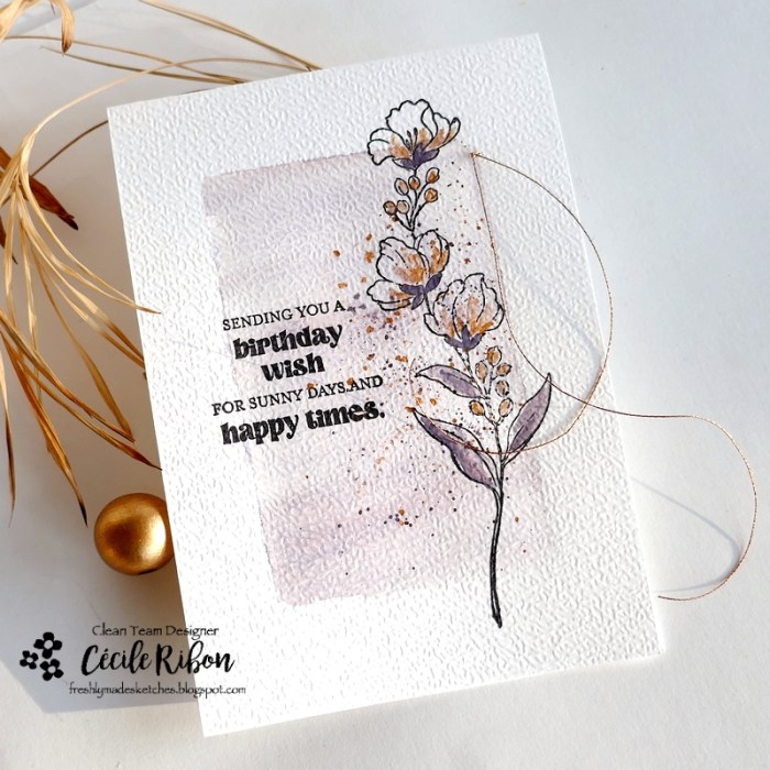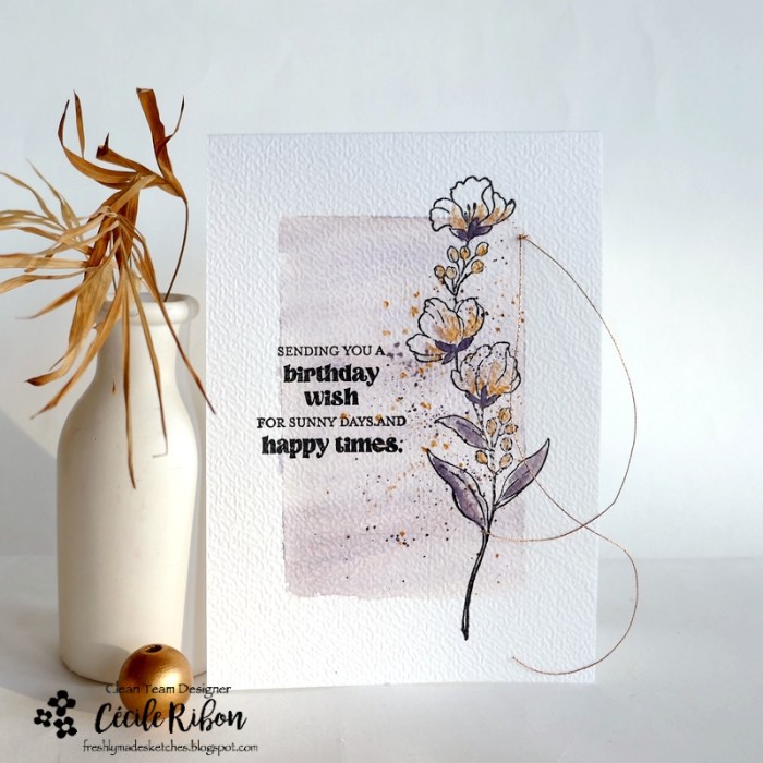 Happy Wednesday everyone! It’s time for a new Freshly Made Sketches challenge and Narelle has come up with a lovely sketch for you to play with. A leafy twig and some splashes, what more could I ask for? So I interpreted it quite litterally and, apart from the thread,  created an almost one-layer card by playing with my watercolors and some stamps (All products kindly gifted by Penny Black See below for details with clickable links to the products I used )