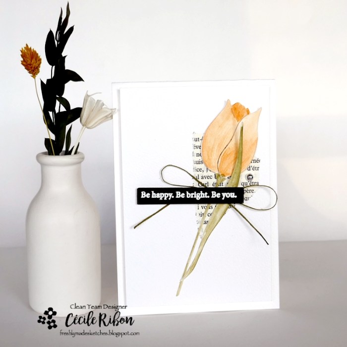 Happy Wednesday everyone! It’s time for a new Freshly Made Sketches challenge and Amy has come up with a lovely super clean sketch for you to play with. It can be interpreted in so many ways. I decided to go for very simple card with a background made out of a torn page from an old book and just added a big tulip to it. (All products kindly gifted by Penny Black See below for details with clickable links to the products I used )