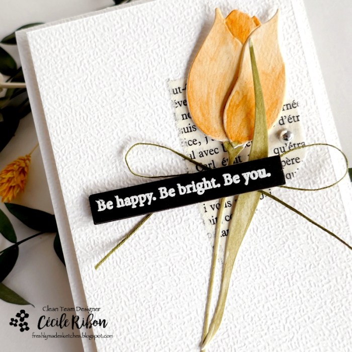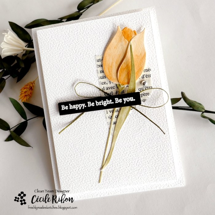 Tulips are my favourite flower and this one is so pretty! What a fantastic card Cecile! I love that piece of torn paper and the twine! So simple yet so elegant!
