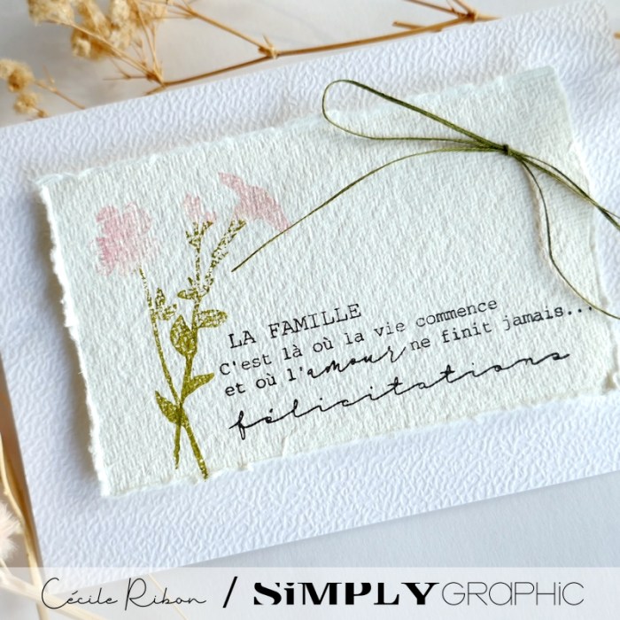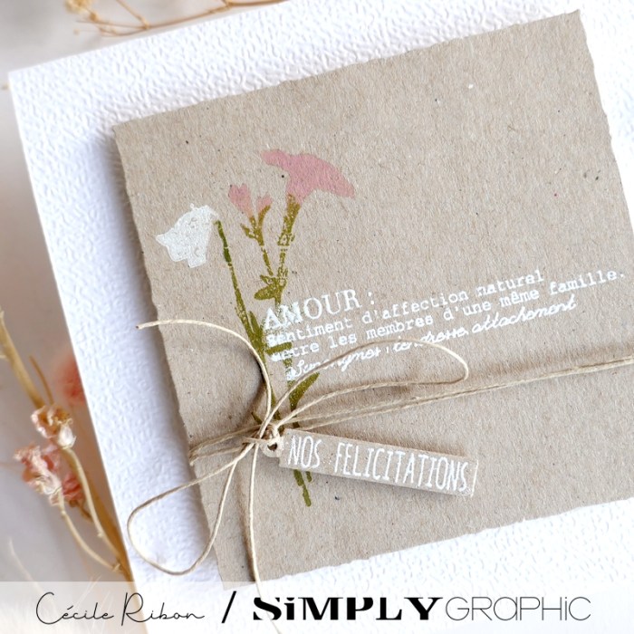 Ces superbes tampons m’ont donner envie d’une ambiance très nature et j’ai joué sur les couleurs douces et les matières avec un fond kraft pour l’une des cartes et du papier chiffon (fait principalement de coton) pour l’autre.