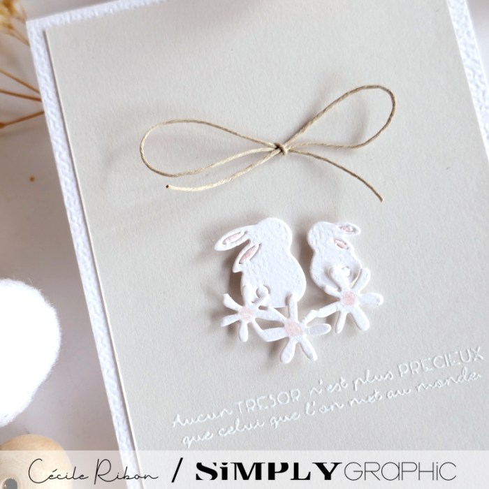 C’est justement l’option que j’ai prise pour ce duo de cartes de félicitations pour des naissances. J’ai utilisé le set de matrices de coupe « Œufs de Pâques » en recoupant les découpe pour ne garder que ce qui m’intéressait : les lapins et les fleurettes. Au final, deux cartes minimalistes mais très tendres et pouvant correspondre aussi bien, à un bébé garçon qu’à une petite fille.