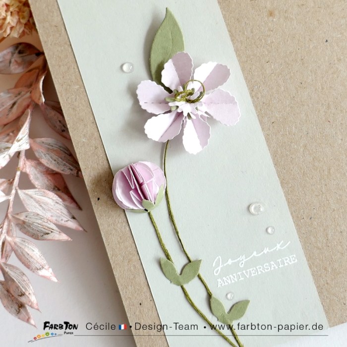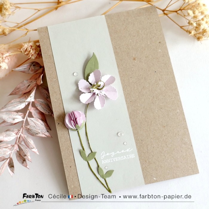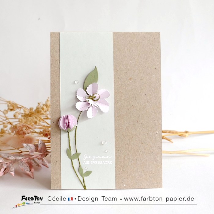 Une carte d’anniversaire fleurie réalisée pour le plaisir de jouer avec les superbes matrices de coupe Farbton Papier . Certaines d’entre-elles ont été détournées de leur usage premier, pour réaliser, entre autres choses, le bouton de fleur