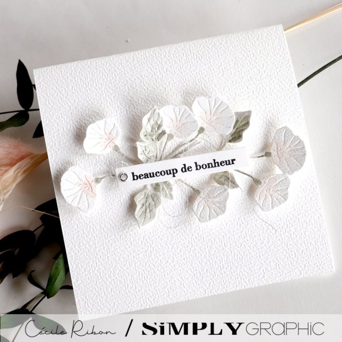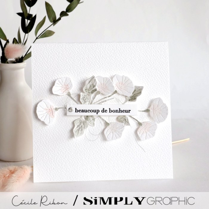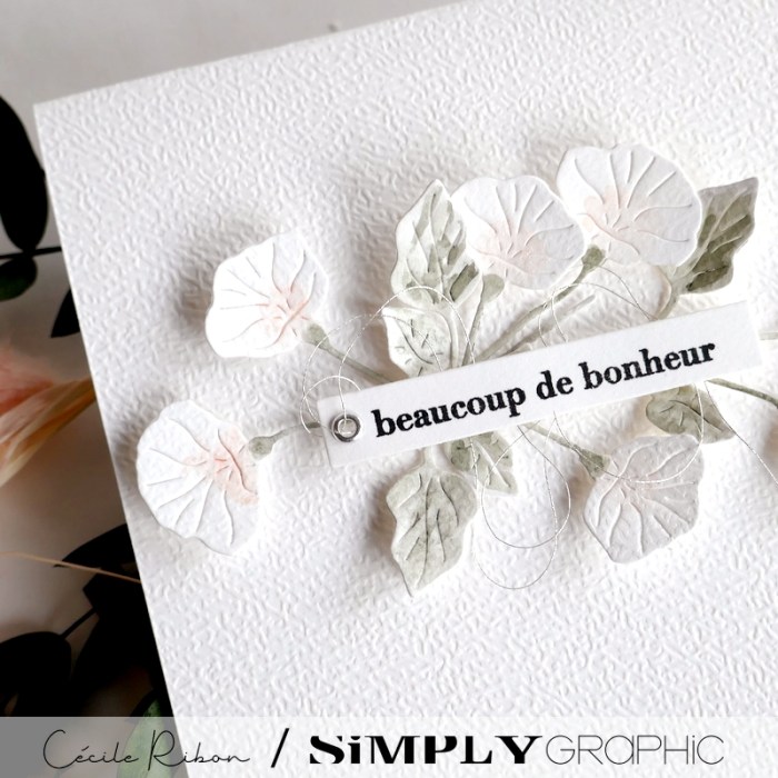 Pour cette carte, j’ai choisi le set de matrices de coupe « Pétunias » et, pour un rendu tout en délicatesse, j’ai très légèrement colorisé les fleurs avec un jus très clair à l’aquarelle . Un sentiment, un peu de fil blanc et c’est tout.