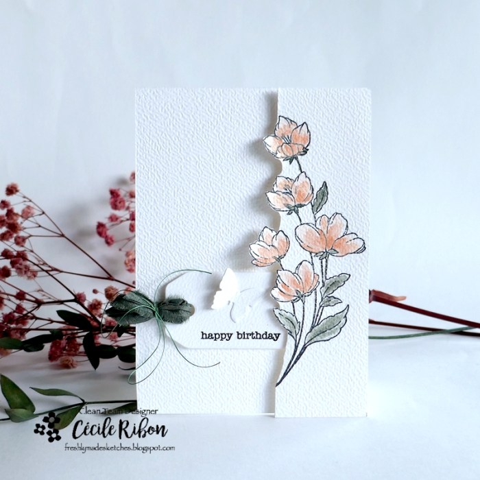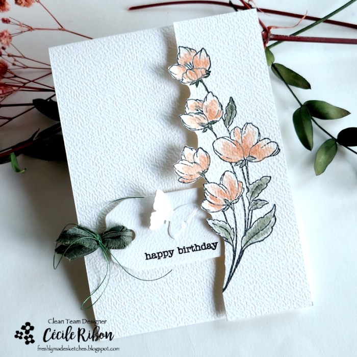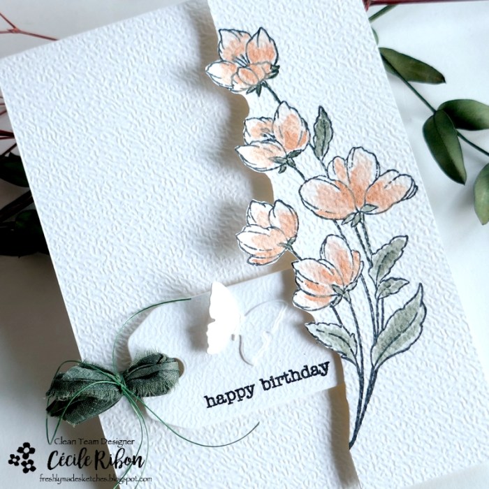 Le nouveau challenge Freshly Made Sketches est en ligne et, cette semaine, Jen M vous propose un très joli sketch avec lequel j’ai pris quelques libertés d’interprétation pour réaliser une carte d’anniversaire résolument féminine. J’ai détouré la partie gauche de la branche fleurie pour représenter la bande festonnée du sketch. Tous les produits m’ont été offerts par Penny Black voir sous les photos pour la liste des produits utilisés et les liens pour les retrouver en boutique