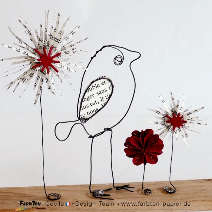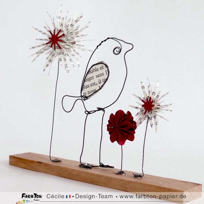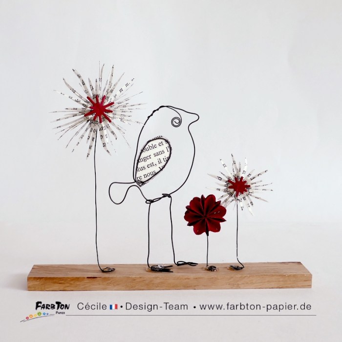 Voici donc un oiseau façonné avec du fil de fer recuit noir et quelques fleurs réalisées avec les jolies matrices de coupe Farbton Papier . Le tout est collé sur une réglette en chêne brut. J’adore travailler l’association fil de fer, papier et bois.