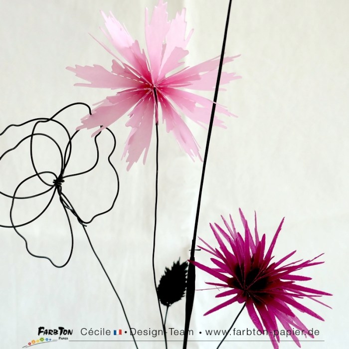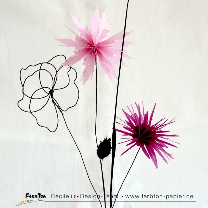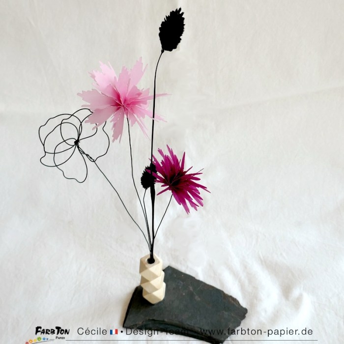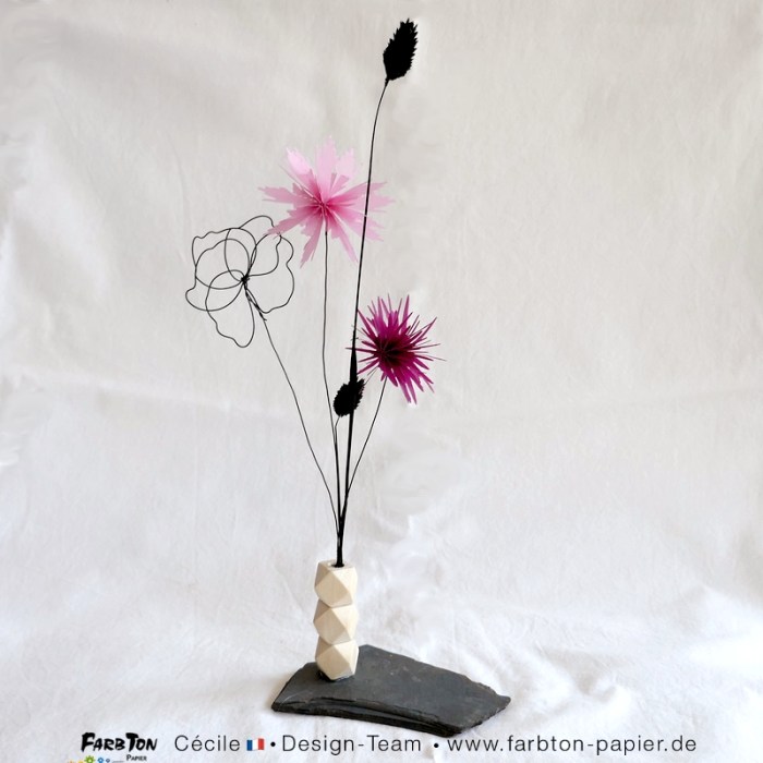 Pour l’occasion, voici donc un bouquet de fleurs roses réalisées en papier calque avec des matrices de coupe Farbton Papier, bien sûr, auxquelles j’ai ajouté quelques fleurs séchées et un fleur façonnée avec du fil de fer noir.
