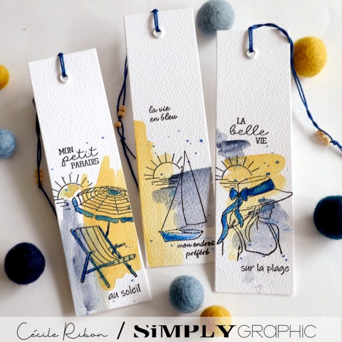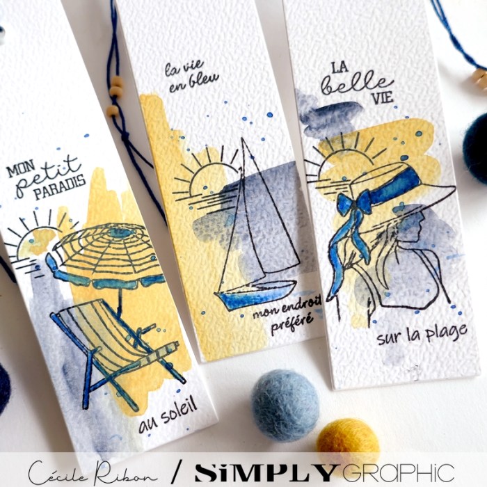 Et pour moi ce sera un ensemble de marque-pages réalisés avec des tampons de la nouvelle collection que vous pourrez bientôt retrouver en boutique. Et je peux déjà vous dire qu’il y a une avalanche de nouveautés (tampons et dies) et rien que des pépites placées sous le thème de la Dolce Vita.