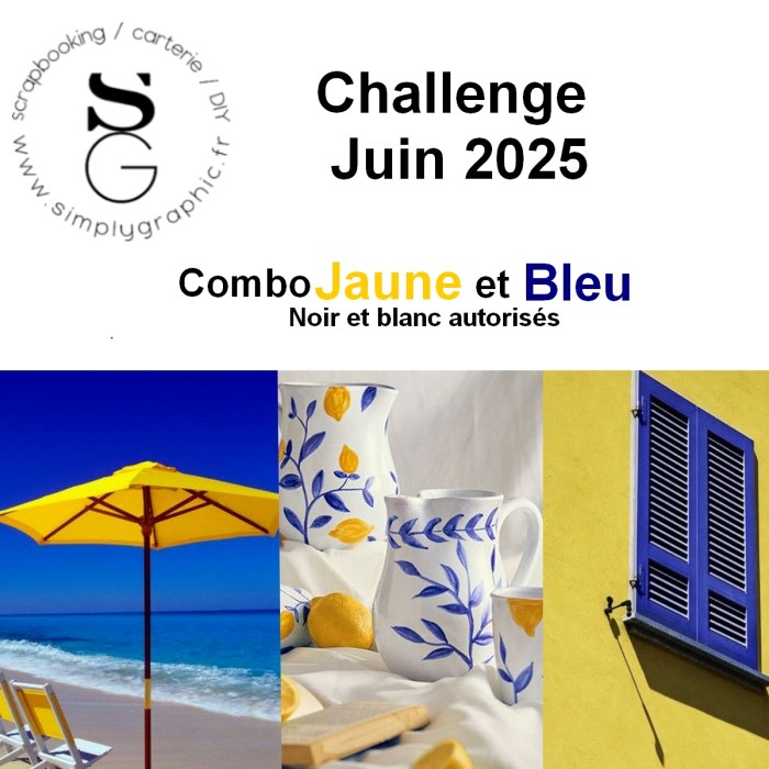 Voici votre mission du mois pour le challenge sur le Groupe Simply Graphic (groupe Facebook). En l’honneur de la collection d’été qui arrive bientôt nous vous proposons de scrapper en Jaune et Bleu.