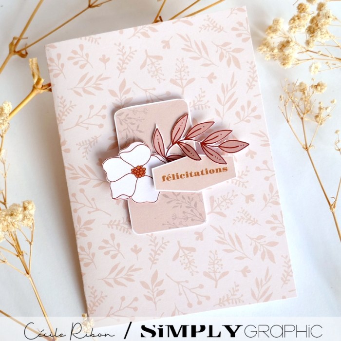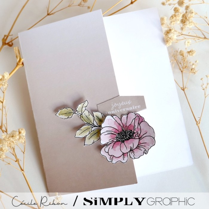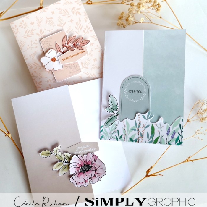 Je me suis donc prêtée au jeu et j’ai réalisé 3 cartes en utilisant exclusivement des éléments compris dans le kit. Je me suis juste autorisée à sortir mes aquarelles pour coloriser l’une des fleurs (celle de la carte d’anniversaire) et quelques feuillages (ceux des cartes d’anniversaire et de remerciement) Sur la carte de félicitations, les éléments utilisés sont déjà colorisés dans le kit.