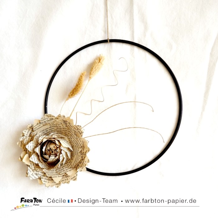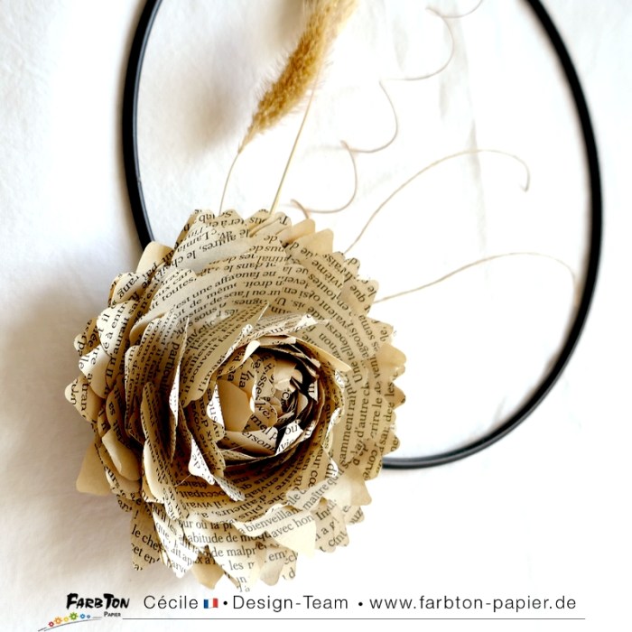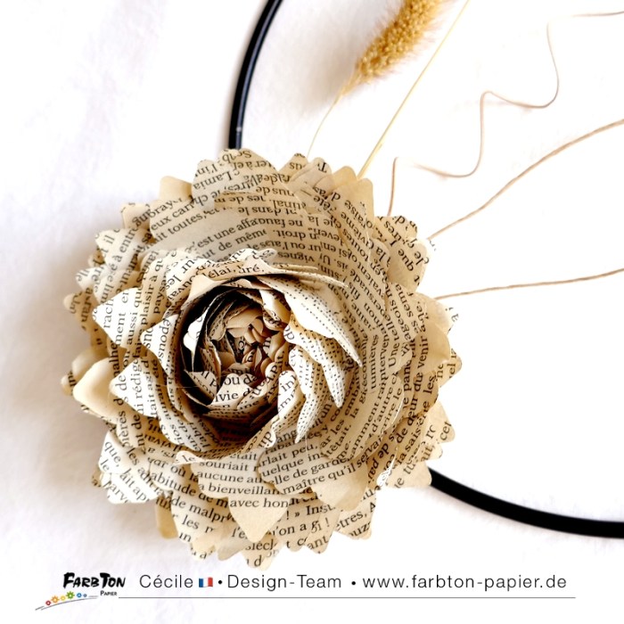 Mais, au lieu d’utiliser du papier crépon, j’ai coupé les pétales dans des pages de livre. Le rendu est moins aérien mais cela fonctionne très bien également et donne à la fleur un style différent, plus « brut » en quelque sorte.
