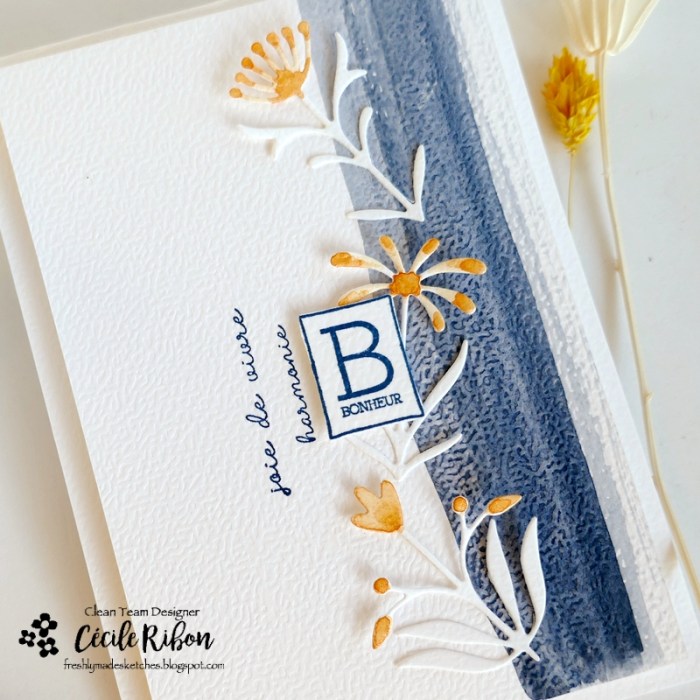 Le nouveau challenge Freshly Made Sketches est en ligne et, c’est au tour de Narelle de vous proposer le sketch de la semaine. Celui qu’elle a dessiné tout spécialement pour vous est résolument graphique et j’ai choisi de le rendre un peu plus doux en remplaçant les carrés par des fleurs et un peu d’aquarelle.