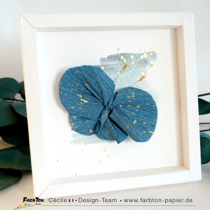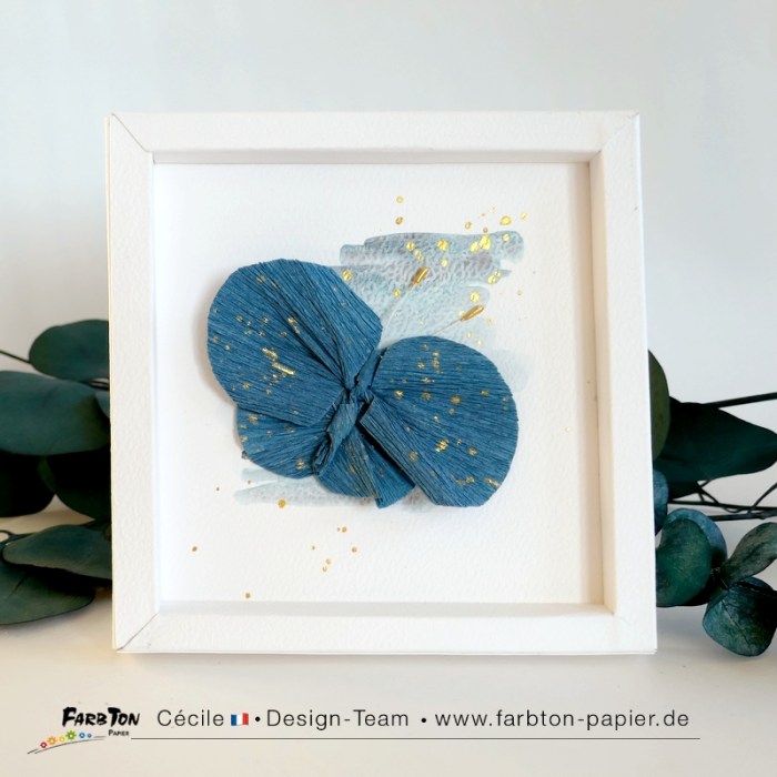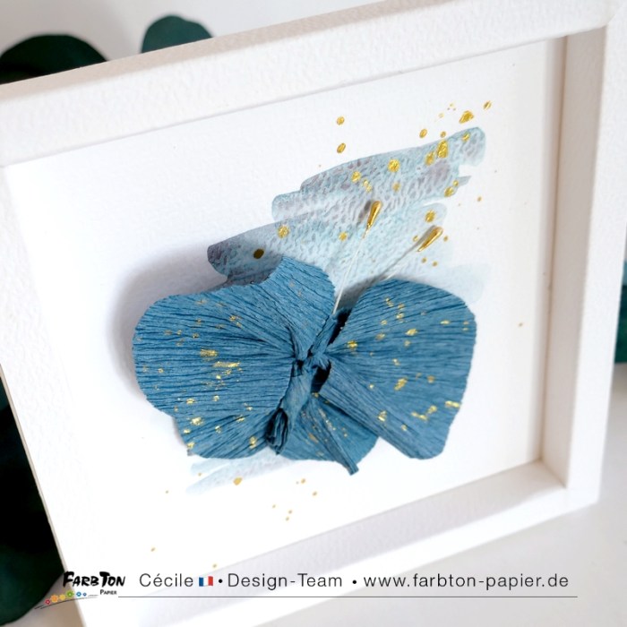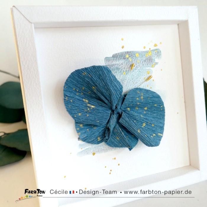 J’ai déjà réalisés deux projets en variant les façons d’assembler les fleurs et le papier utilisé. Cette fois, je suis partie dans une autre direction en utilisant des pétales de fleurs pour former un papillon (avec les matrices de coupe 413L et 413S). Les antennes sont faites avec des « pistils » de fleur colorisés avec de l’aquarelle couleur or.