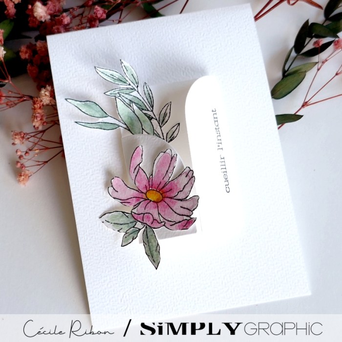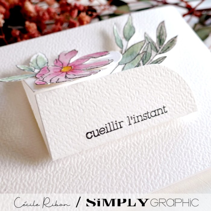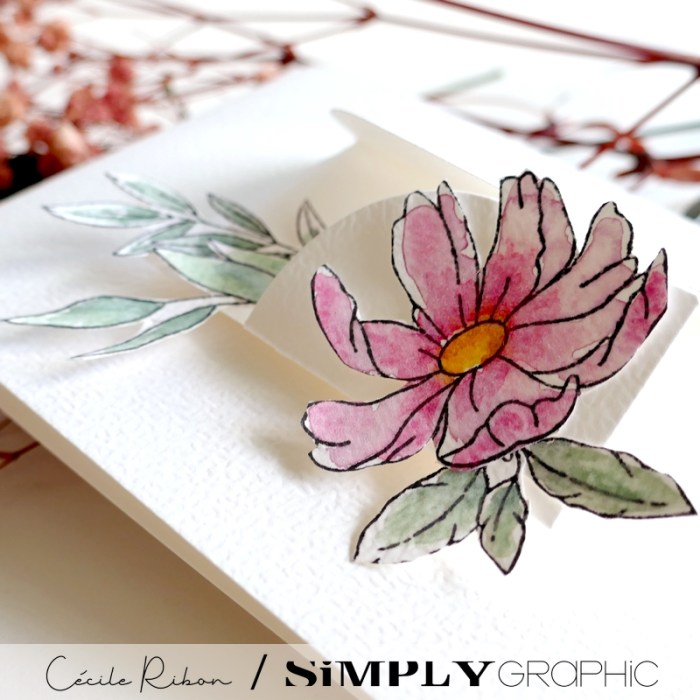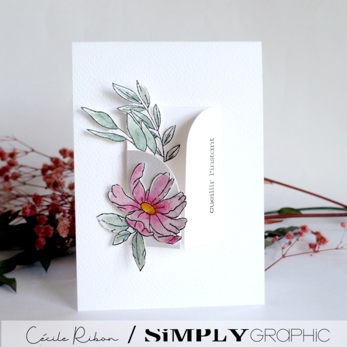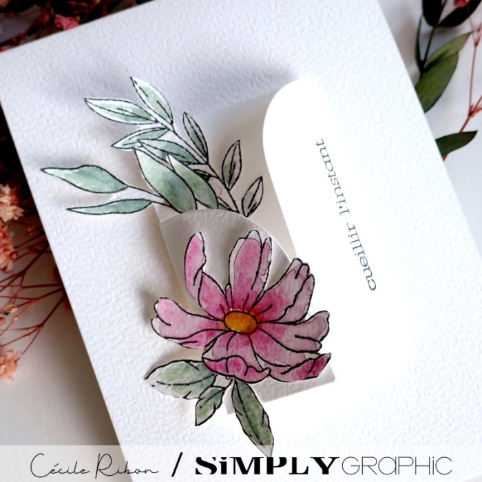 Pour aujourd’hui voici une carte sans saisonnalité, réalisée avec les superbes nouvelles planches de tampons fleurs et feuillages. Des classiques qui serviront dans bien des occasions. Pour un montage en volume et original, j’ai choisi de disposer la fleur et les feuillages sur une mini-carte à volets asymétriques (une nouvelle matrice de coupe de la collection été)