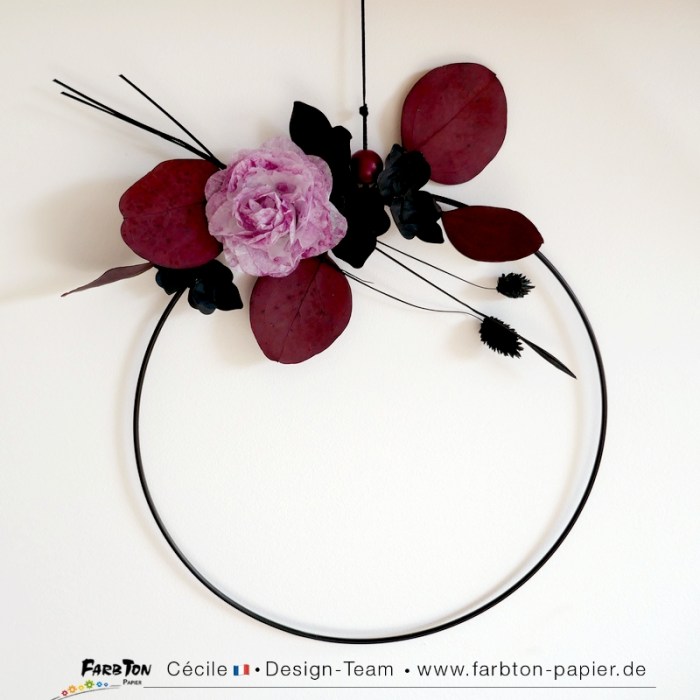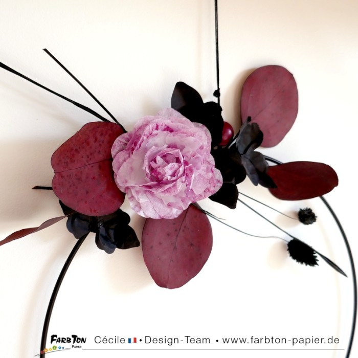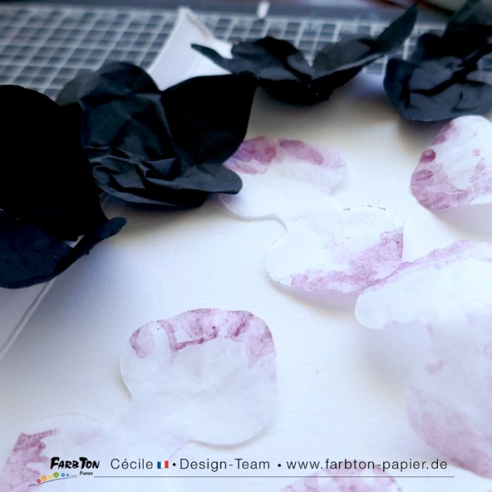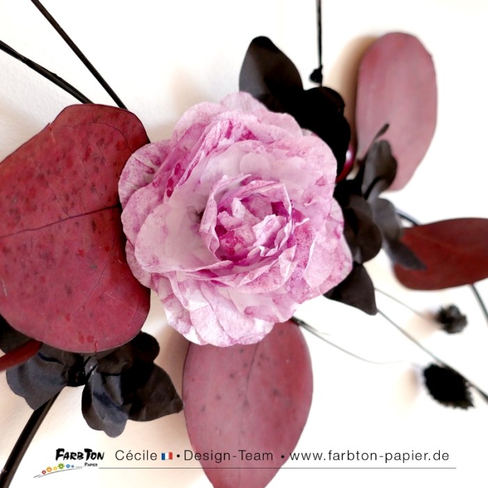 J’ai déjà réalisés trois projets en variant les façons d’assembler les fleurs et le papier utilisé et même transformer les fleurs en papillon. Cette fois, j’ai testé la réalisation des fleurs en utilisant de papier de soie blanc légèrement aquarellé et cela fonctionne à merveille. Les feuilles sont réalisées avec ces mêmes matrices de coupe mais avec du papier de soie noir légèrement plus épais, je les ai « chiffonnées » et tortillées pour leur donner du relief.