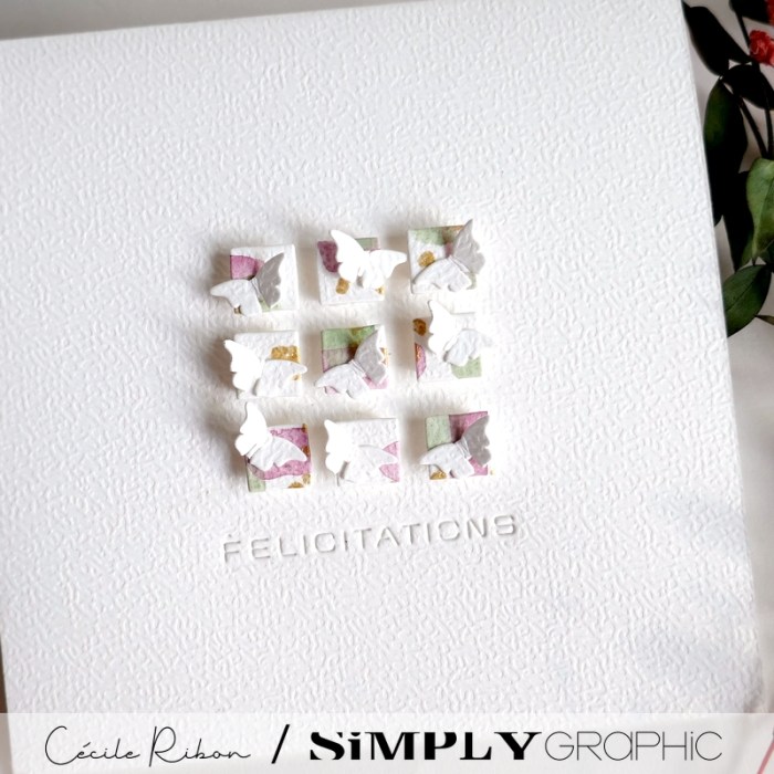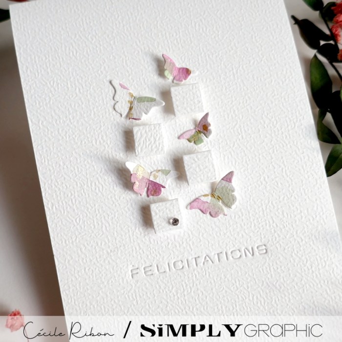 Cette fois, j’ai choisi la ligne 1 : Carré – Rose – Papillon. Ces consignes m’ont inspiré un duo de cartes de félicitations, par un mariage, par exemple.