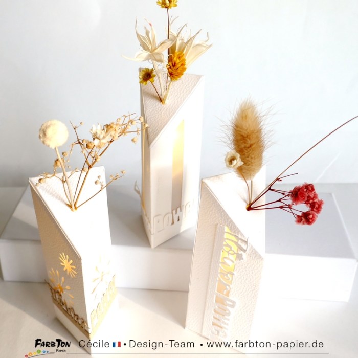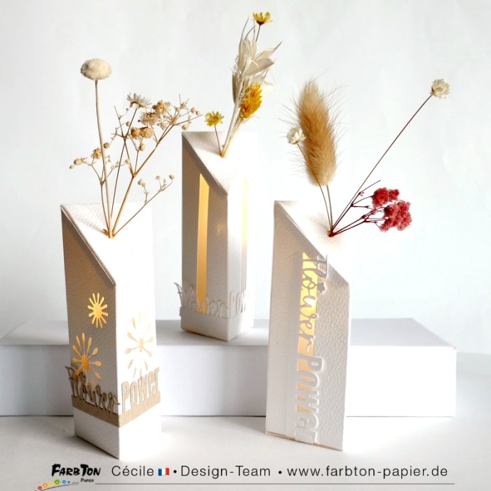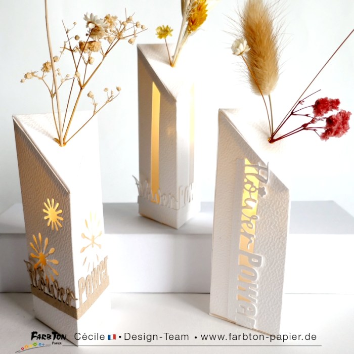 J’ai détourné les boîtes pour en faire un trio de photophores aux formes géométriques. Je les ai agrémentés de quelques fleurs séchées et des nouvelles découpes « Flower Power ». Sur l’un d’eux, j’ai également utilisé l’un des sets « centre de fleur » (Mittelpunkt) présentés dernièrement pour faire des ouvertures dans le corps de la boîte photophore et laisser passer la lumière.