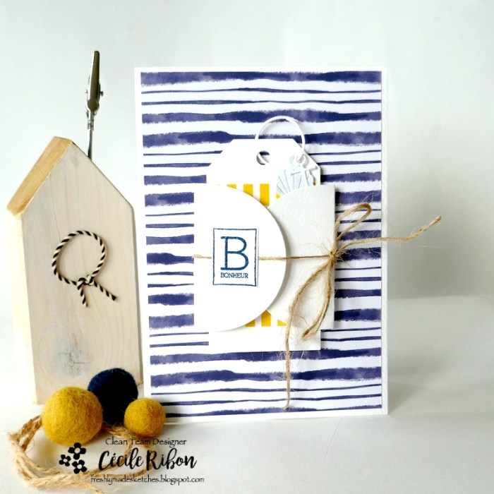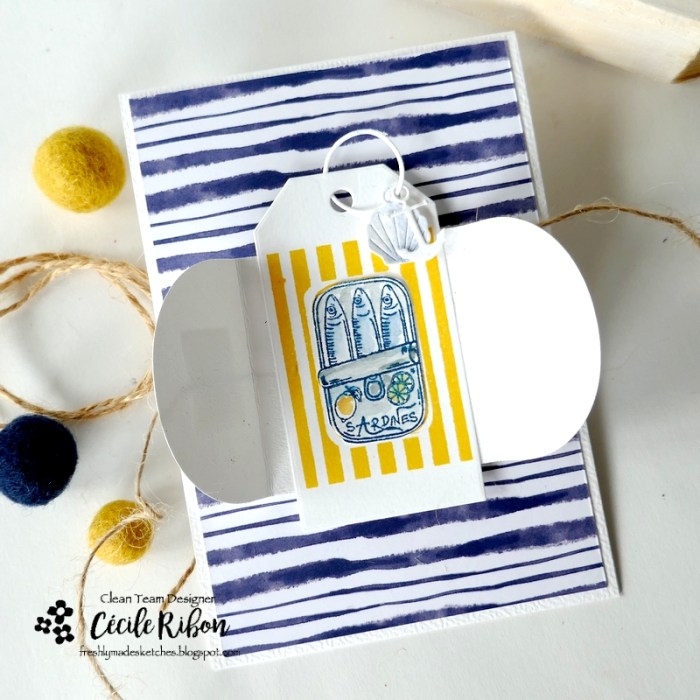 Le nouveau challenge Freshly Made Sketches est en ligne et, c’est au tour de Jen M de vous proposer le sketch de la semaine. Celui qu’elle a dessiné tout spécialement pour vous est très original avec cette simple superposition de deux panneaux. Pour l’illustrer, j’ai choisi de réaliser une carte avec un élément à deux volets s’ouvrant sur un tag.