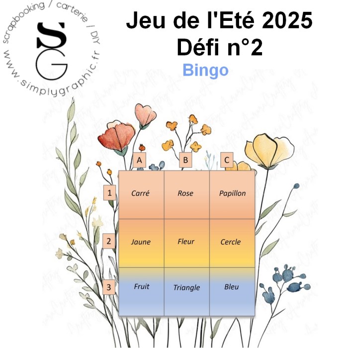 Pour votre seconde mission, nous avons imaginé un bingo, 3 lignes et 2 colonnes et donc 6 propositions créatives, à vous de choisir celle qui vous inspire le plus. Toutes les consignes correspondantes doivent donc être présentes sur votre réalisation, mais vous pouvez ajouter d’autres éléments si vous le souhaitez.