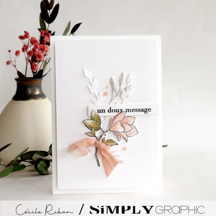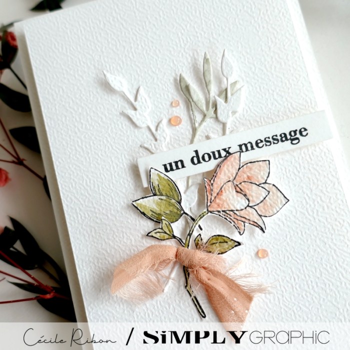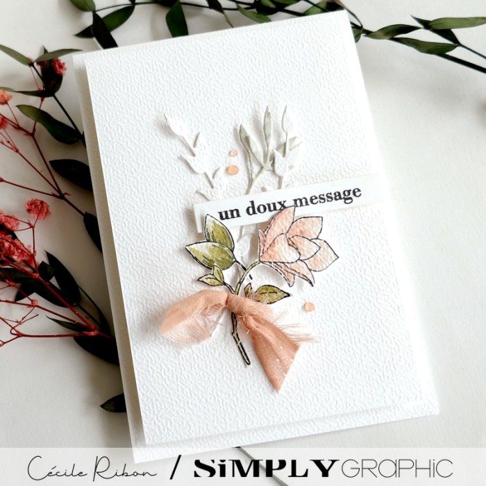 Pour cette troisième carte. Tous les éléments proviennent de ma « boîte à restes », feuillages déjà découpés, la fleur tamponnée, aquarellée et détourée. Et même le tamponnage du sentiment et le nœud attendaient sagement de trouver une place sur une carte. Bref, je n’ai eu qu’à assortir et agencer. J’avoue que je passe quand même un bon moment à farfouiller parmi les découpes et les tamponnages avant de dénicher les éléments s’accordant parfaitement.