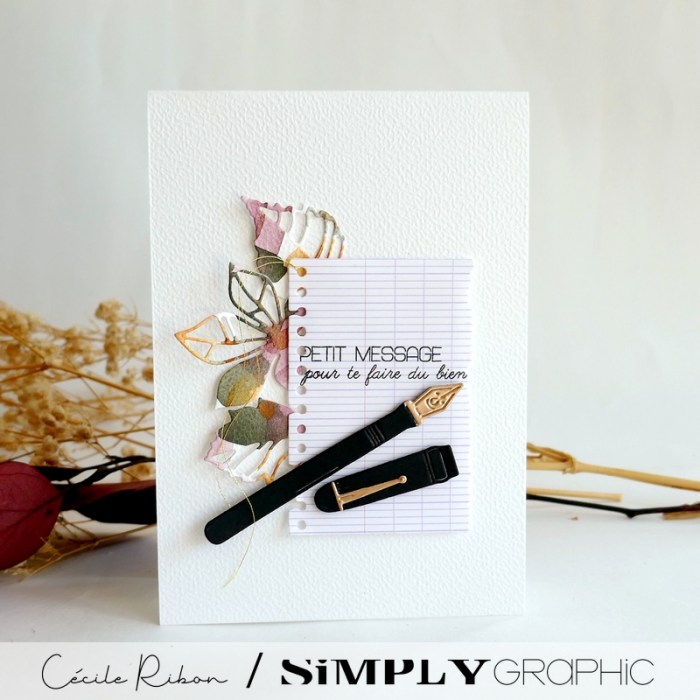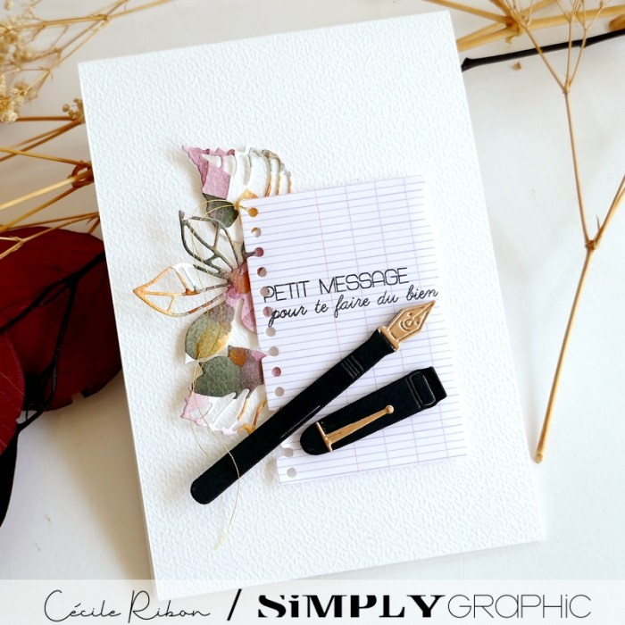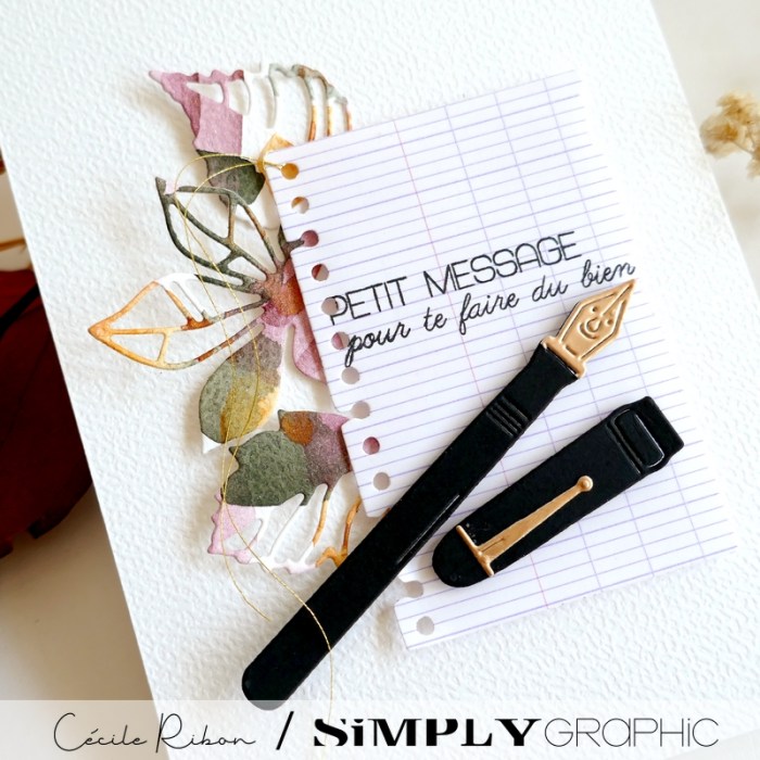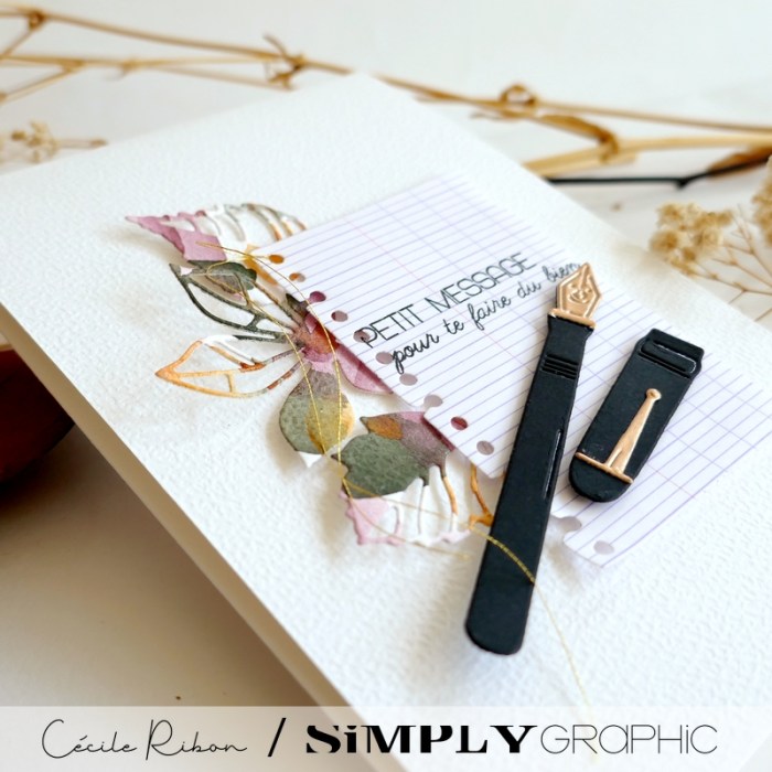 Le thème demandé était une carte d’ambiance été indien, rentrée (et oui déjà). J’ai donc imaginé une carte aux teintes annonçant l’automne mais encore fraîches et comportant quelques éléments évoquant la rentrée mais pouvant également parfaitement convenir pour envoyer un petit mot amical. Bien sûr, elle est réalisé à 100% avec des produits Simply Graphic en piochant dans diverses collections.