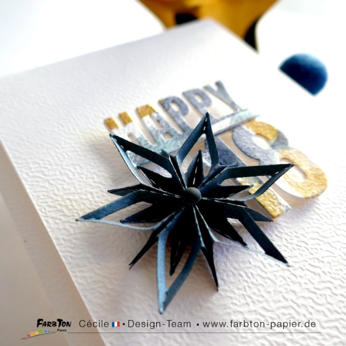 Carte réalisée avec, cette cette fois encore, le nouveau set de matrices de coupe « chiffres » mêlant différentes formes et calligraphies. Juste parfait pour des cartes d’anniversaire, des cartes de vœux, des calendriers de l’Avent … Ainsi qu’une nouvelle matrice de coupe permettant de réaliser des étoiles ajourées et que je trouve vraiment super élégantes .