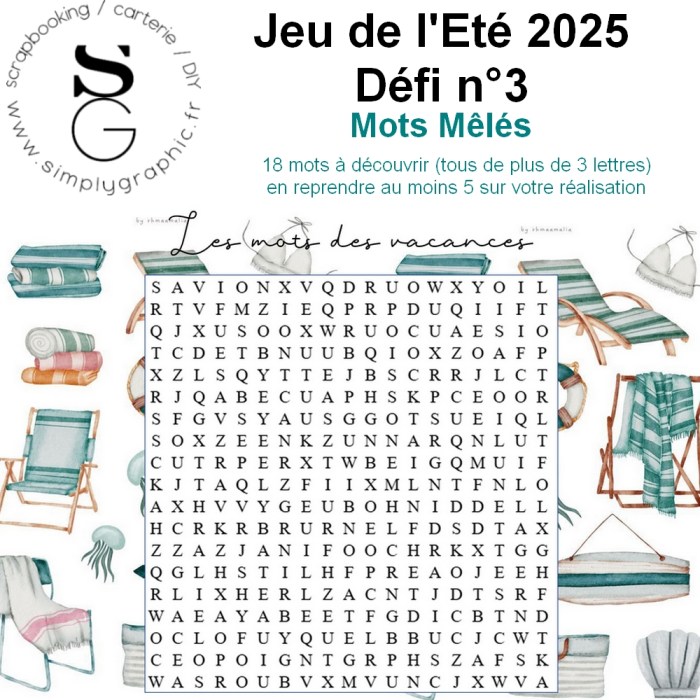 Pour votre troisième mission, nous vous proposons un grand classique des jeux de l’été : une grille de mots mêlés. Elle cache 18 mots sur le thème des vacances (ils ont tous plus de 3 lettres) . Saurez-vous les dénicher et en reprendre au moins 5 sur votre réalisation ? Vous pouvez compléter avec d’autres éléments si vous le souhaitez.