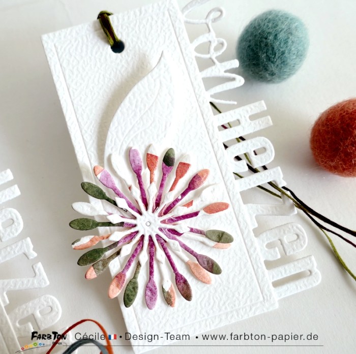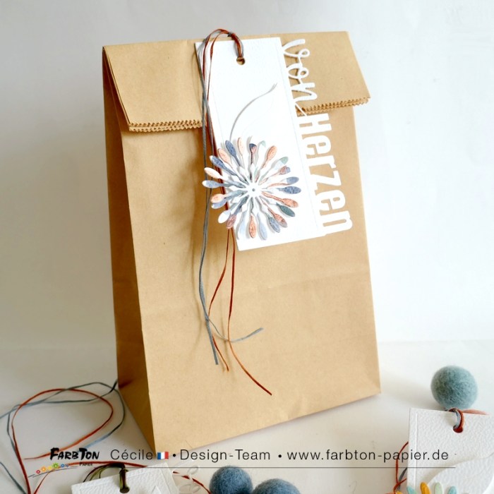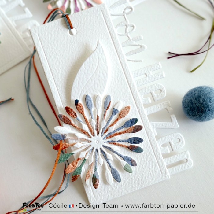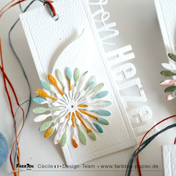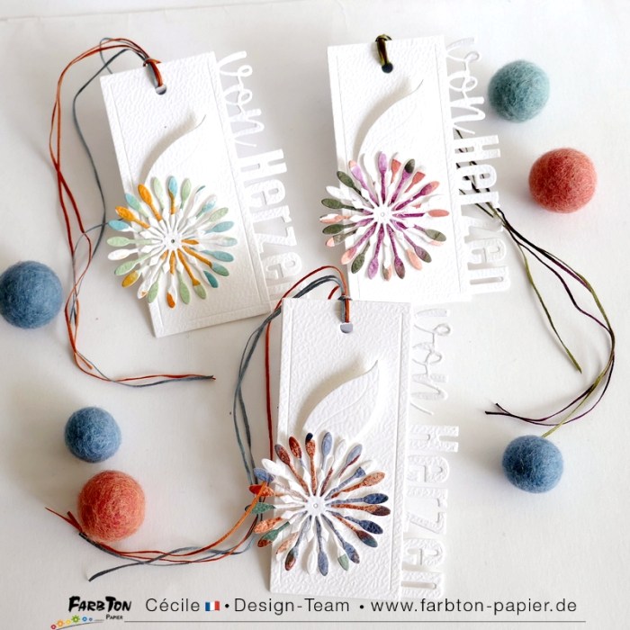 Un ensemble d’étiquettes cadeaux réalisées avec quelques unes des très chouettes nouveautés Farbton Papier et également quelques matrices de coupe plus anciennes .