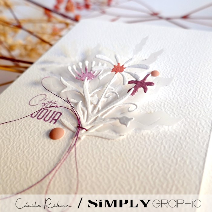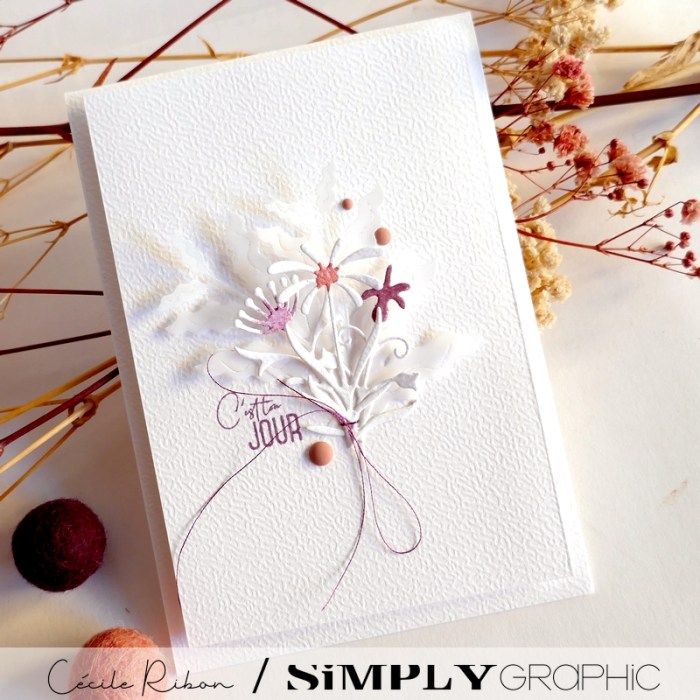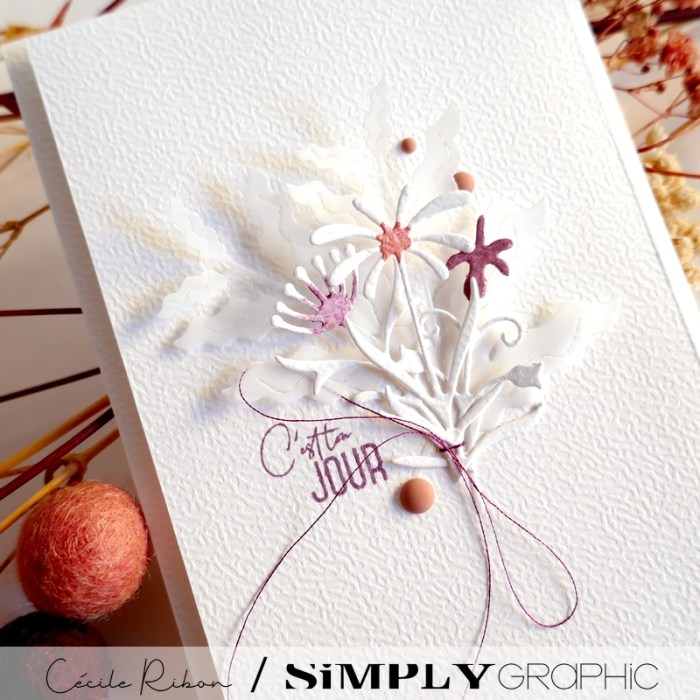 Une carte d’anniversaire réalisée pour le seul plaisir de jouer avec les si délicates découpes fleurs et feuillages de la collection été 2025 de Simply Graphic.
