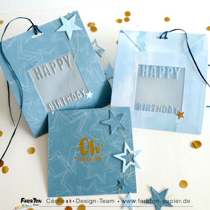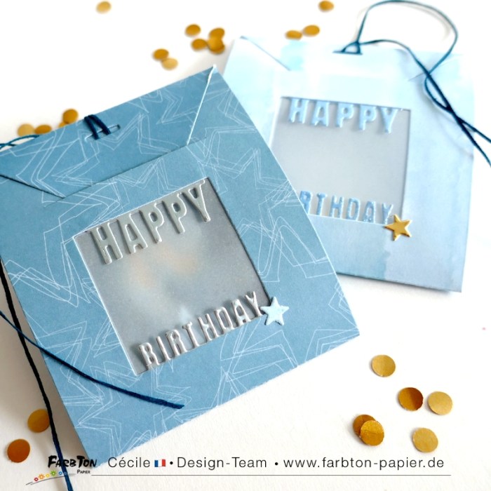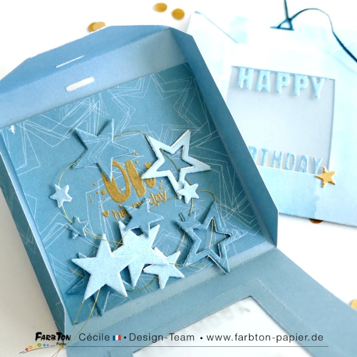 J’ai choisi de vous présenter un set de matrices de coupe initialement destiné à réaliser de jolies pochettes pour offrir des sachets de thé. Mais j’ai eu envie de les détourner pour en faire des petites pochettes surprises pour anniversaire. Avec, à l’intérieur, une mini carte pour mettre un petit mot et une guirlande d’étoiles montée sur un fil or .