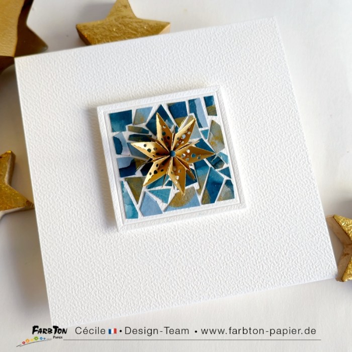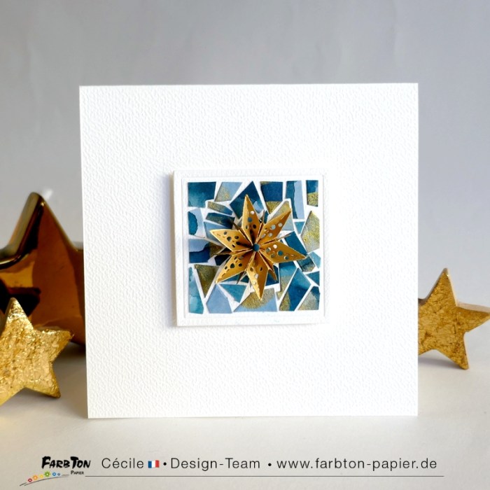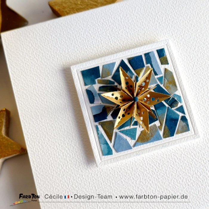 Après la réalisation des décos de Noël en forme de gouttes présentées avant-hier, il me restait plein de chutes de découpe que je n’avais pas envie de jeter car j’aime bien les couleurs et le rendu de mon papier « home made ». (Réalisé à l’aquarelle). J’ai donc utilisé une partie de ces chutes en les recoupant en petits morceaux pour en faire un fond façon mosaïque de papier sur lequel j’ai simplement collé une étoile confectionnée avec l’une des nouvelles matrices de coupe  Farbton Papier